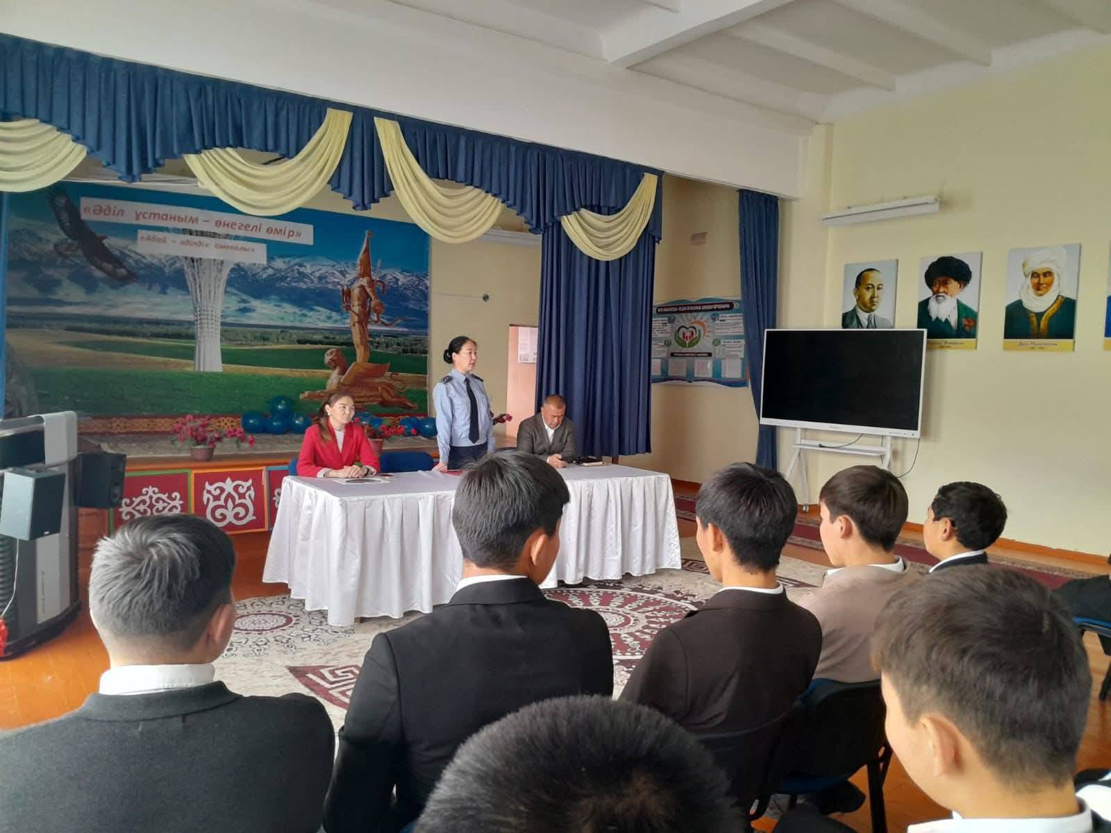 Полицейлер Түркістан облысы Бәйдібек ауданындағы мектеп оқушыларына арналған «Жасөспірімдер арасындағы әлімжеттік мәселелері» тақырыбында кездесу өткізді.