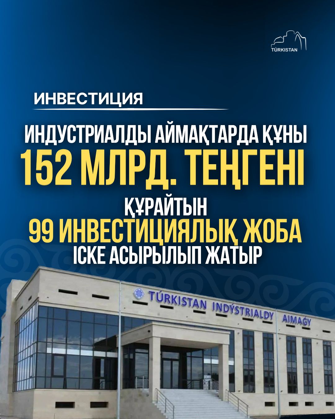 Түркістан облысындағы индустриалды аймақтарда құны 152 млрд. теңгені құрайтын 99 инвестициялық жоба іске асырылып жатыр