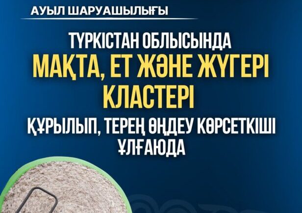 – Өңірдің географиялық-климаттық ерекшелігін ескере отырып, 3 кластерлік бағытты дамытуды қолға алдық. Олар: мақта, ет және жүгері кластері. Су үнемдеу технологияларын қолдана отырып, мақтаның элиталық сорттарын өсіруді және шикізатты терең өңдеуді қамтитын мақта-тоқыма кластері құрылды. Кластер – өндірістік процестің барлық кезеңдерін қамтамасыз етеді, мақта өсіруден бастап, жіп, мата сияқты дайын тоқыма өнімдері өндіріледі. Мақта кластерінде 5 жобаны іске асыру нәтижесінде 7 мыңнан аса адам жұмыспен қамтылып, 201 млрд. теңге инвестиция тартылады деп күтіліп отыр. Мақта өнімділігі 2-3 есеге артады. Жылына 229 мың тонна мақта өндіріледі. Биыл пилот ретінде Отырар ауданында 32 мың гектар алқапқа жаңа әдіспен мақта егілді. Түсім өте жақсы болды. 2 мақта өңдеу зауыты іске қосылды. Жіп иіру фабрикасының құрылысы аяқталуда, – деді Түркістан облысының әкімі Нұралхан Көшеров.