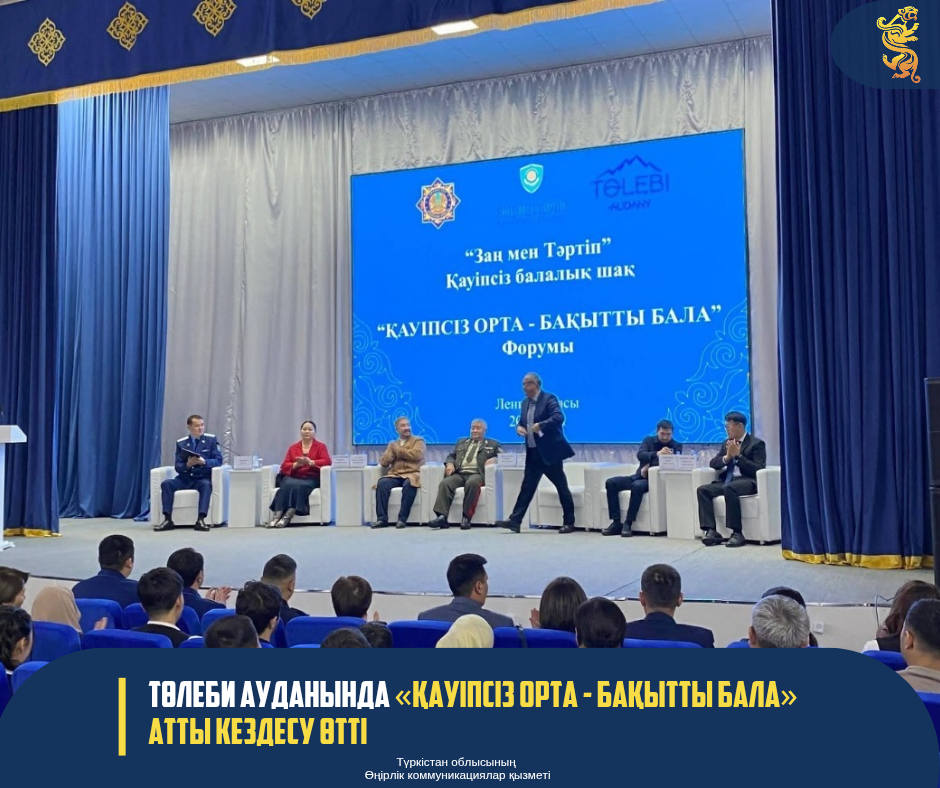 Төлеби ауданында «Заң мен тәртіп» қағидаты мен «Қауіпсіз балалық шақ» концепциясы аясында «Қауіпсіз орта — бақытты бала» атты жастармен мазмұнды кездесу өтті. Шараның басты мақсаты — жастар арасында заңға деген құрметті арттыру, тәртіп пен қауіпсіздік құндылықтарын нығайту, сондай-ақ салауатты өмір салтын кеңінен насихаттау. Кездесуге ҚР еңбек сіңірген әртісі, «Дарын» мемлекеттік сыйлығының иегері Нұрлан Өнербаев, елімізге танымал теолог-дінтанушы, имам Нұрлан қажы Асанов, белгілі қазақ MMA файтері, ҚР еңбек сіңірген спорт шебері Арман Оспанов, генерал-майор Ақжігіт Исабеков, сондай-ақ ҚР Халық Ассамблеясы жанындағы Аналар кеңесі төрағасының Түркістан облысы мен Шымкент қаласы филиалы бойынша орынбасары Меруерт Медетбекова қатысып, жастармен еркін форматта ашық сұхбат құрды. Одан бөлек, жиынға қатысқан аудан әкімі Еркеғали Әлімқұлов заң мен тәртіпті сақтаған жас ертең саналы азамат болып қалыптасатынын атап өтті.